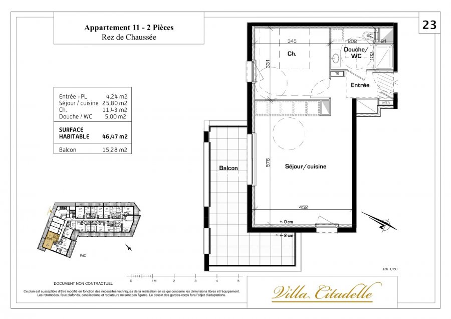 Une cuisine équipée ouverte sur séjour, une chambre, un cellier, ainsi qu'une salle de bains avec WC.